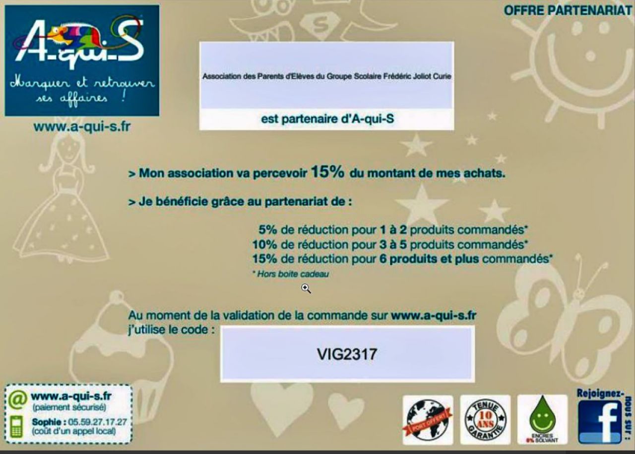 L'association des Parents d‘Elèves du Groupe Scolaire Frédéric Joliot Curie renouvelle son partenariat avec la société A-qui-S.fr, afin de vous faire bénéficier de réductions sur vos commandes d’étiquettes personnalisées.